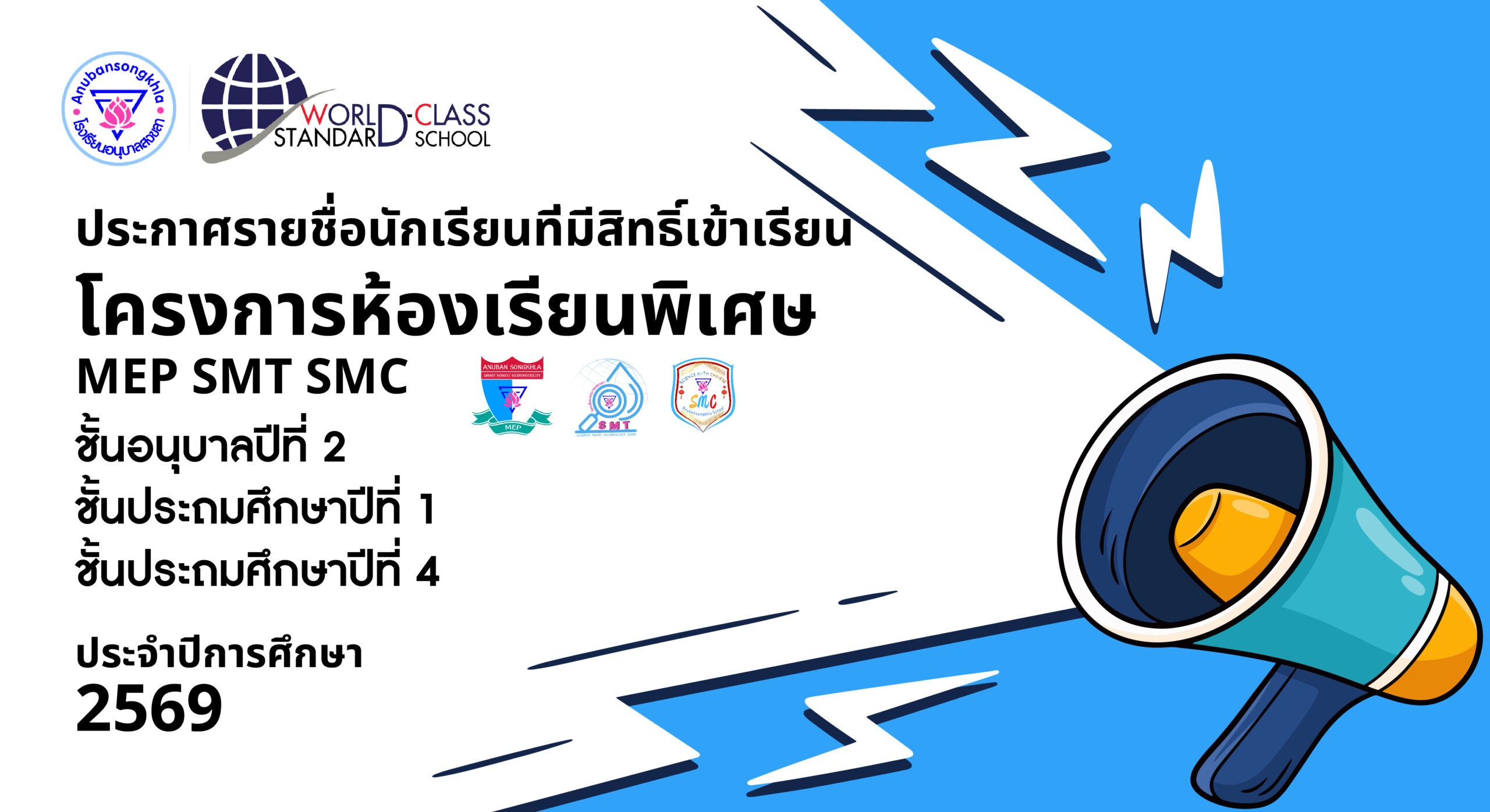 ประกาศรายชื่อนักเรียนที่มีสิทธิ์คัดเลือกเข้าเรียนโครงการห้องเรียนพิเศษ ปีการศึกษา 2569