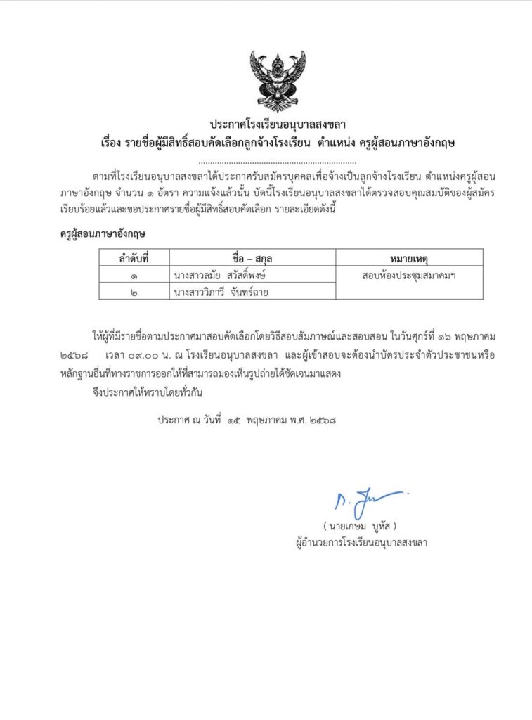 ประกาศรายชื่อผู้มีสิทธิ์สอบคัดเลือกลูกจ้างโรงเรียน ตำแหน่งครูผู้สอนภาษาอังกฤษ