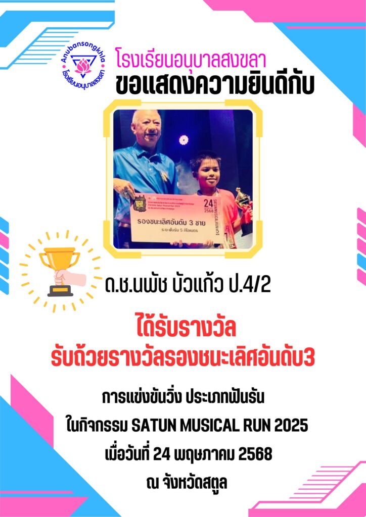 โรงเรียนอนุบาลสงขลาขอแสดงความยินดีกับ เด็กชายนพัช บัวแก้ว ป.4/2 เข้าร่วมการแข่งขันวิ่ง ประเภทฟันรัน ในกิจกรรม Satun Musical run 2025 เมื่อวันที่ 24 พ.ค.2568 ได้รับถ้วยรางวัลรองชนะเลิศอันดับ3 จากนายพิพัฒน์ รัชกิจประการ รัฐมนตรีว่าการกระทรวงแรงงาน