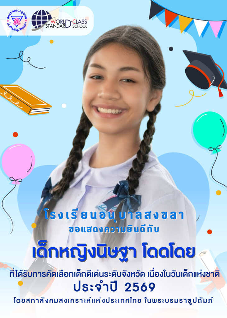 โรงเรียนอนุบาลสงขลาขอแสดงความยินดีกับเด็กหญิงนิษฐา โดดโดย ในโอกาสที่ได้รับการคัดเลือกเด็กดีเด่นระดับจังหวัด เนื่องในวันเด็กแห่งชาติ ประจำปี 2569