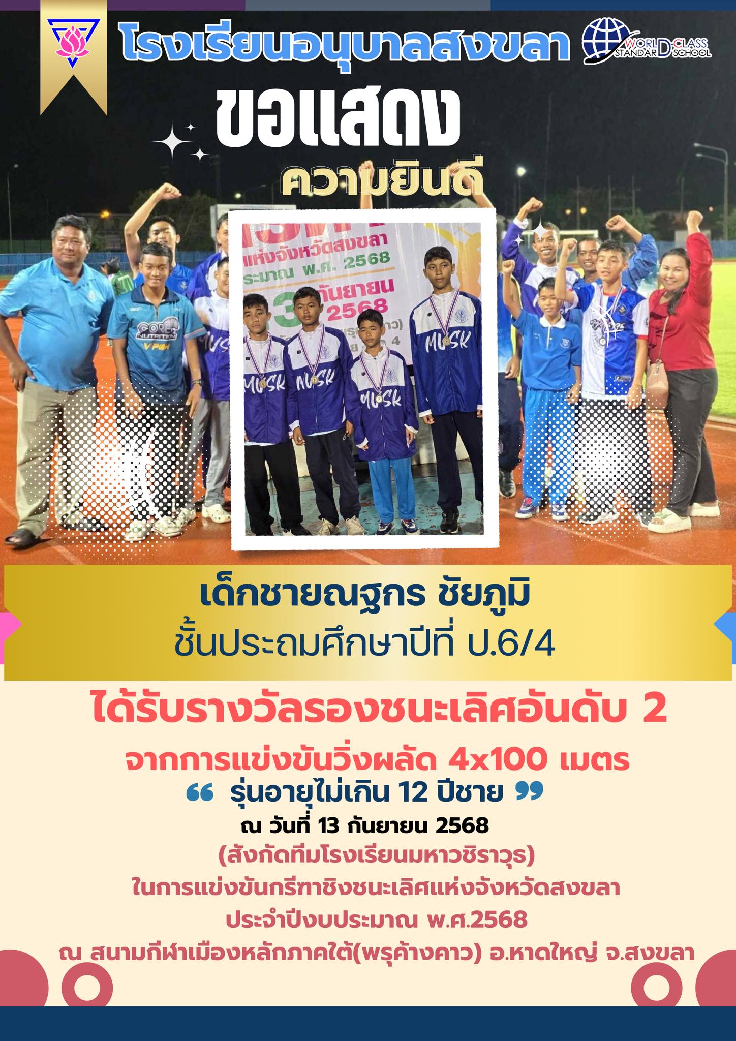 โรงเรียนอนุบาลสงขลา ขอแสดงความยินดีกับ เด็กชายณฐกร ชัยภูมิ นักเรียนชั้น ป.6/4 ที่คว้ารางวัล รองชนะเลิศอันดับ 2 จากการแข่งขันวิ่งผลัด 4×100 เมตร รุ่นอายุไม่เกิน 12 ปีชาย (สังกัดทีมโรงเรียนมหาวชิราวุธ) ในการแข่งขันกรีฑาชิงชนะเลิศแห่งจังหวัดสงขลา ประจำปีงบประมาณ 2568 ณ สนามกีฬาเมืองหลักภาคใต้ (พรุค้างคาว) อ.หาดใหญ่ จ.สงขลา เมื่อวันที่ 13 กันยายน 2568 ความสำเร็จในครั้งนี้คือกำลังใจและแรงบันดาลใจให้กับเพื่อน ๆ และน้อง ๆ นักเรียนอนุบาลสงขลา เดินหน้าสู่ความสำเร็จต่อไป
