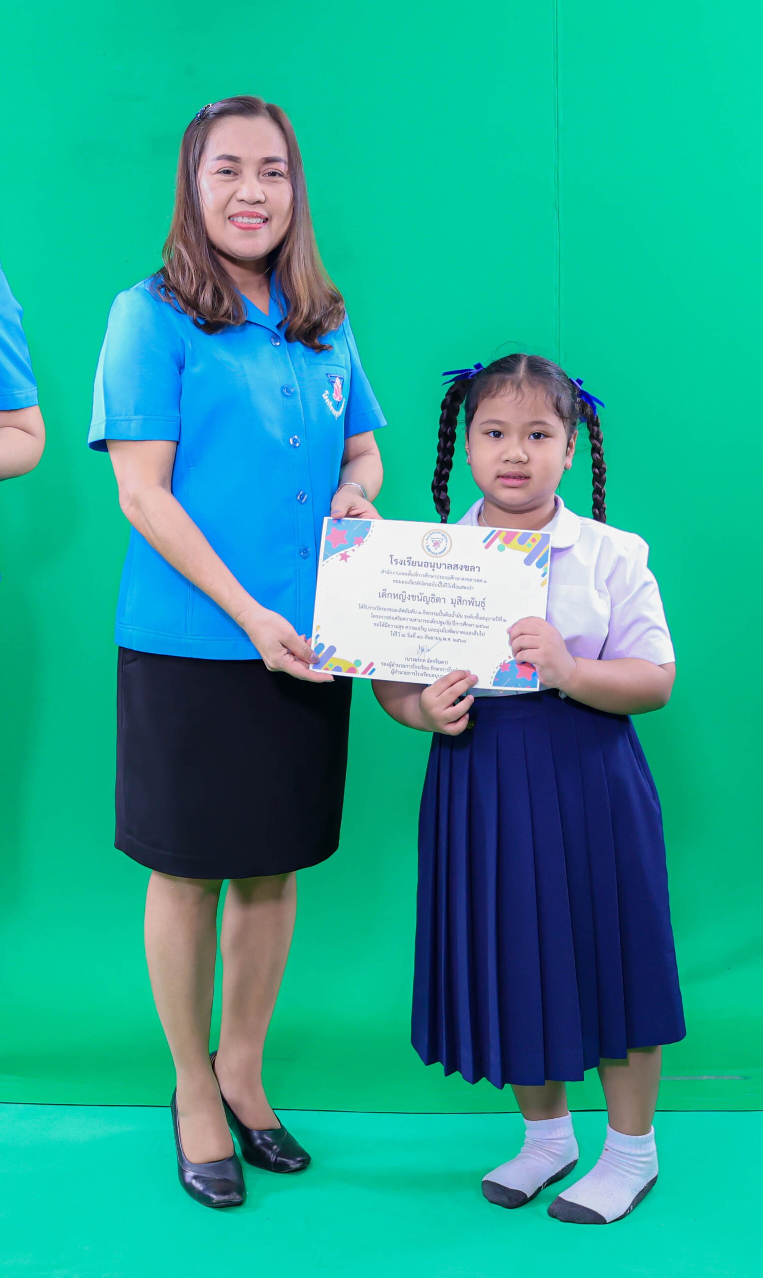 วันอังคารที่ 16 กันยายน 2568 นางมรกต ฉัตรจินดา รองผู้อำนวยการโรงเรียน รักษาการผู้อำนวยการโรงเรียนอนุบาลสงขลา มอบเกียรติบัตรกิจกรรมปั้นดินน้ำมัน เรื่อง ผัก และการเล่านิทานคุณธรรม ตามโครงการส่งเสริมความสามารถเด็กปฐมวัย ระดับชั้นอนุบาลปีที่ 2
