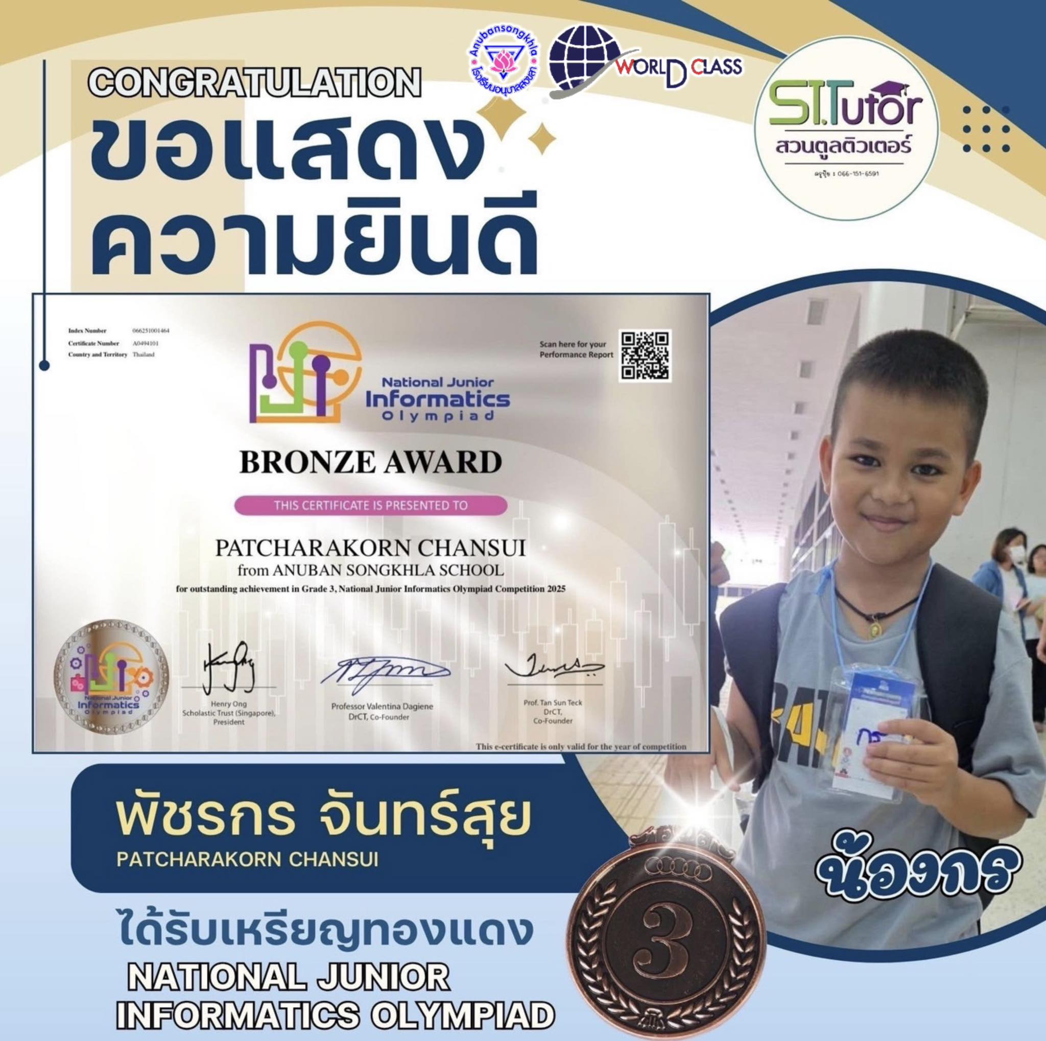 โรงเรียนอนุบาลสงขลาขอแสดงความยินดีกับเด็กชายพัชรกกร จันทร์สุย ชั้นประถมศึกษาปีที่ 3/6 SMC นักเรียนโรงเรียนอนุบาลสงขลา ที่คว้า รางวัลเหรียญทองแดง (Bronze Award) จากเวที National Junior Informatics Olympiad 2025 ภาคภูมิใจในความสำเร็จของลูกศิษย์คนเก่ง