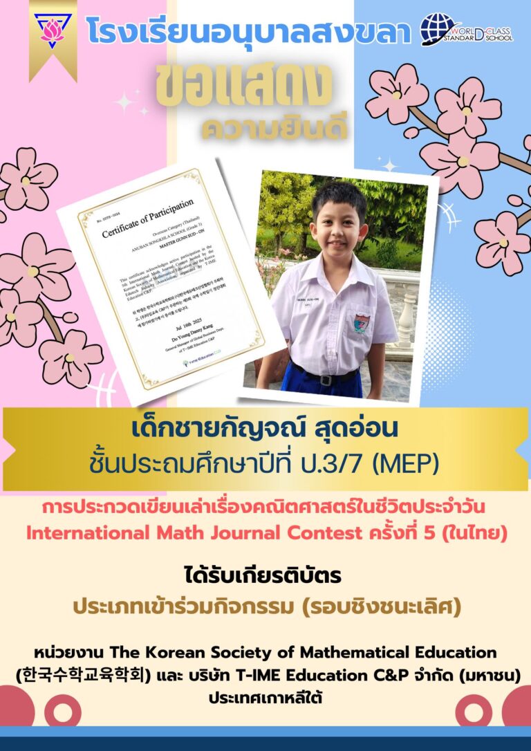 โรงเรียนอนุบาลสงขลาขอแสดงความยินดีกับเด็กชายพัชรกกร จันทร์สุย ชั้นประถมศึกษาปีที่ 3/6 SMC นักเรียนโรงเรียนอนุบาลสงขลา ที่คว้า รางวัลเหรียญทองแดง (Bronze Award) จากเวที National Junior Informatics Olympiad 2025 ภาคภูมิใจในความสำเร็จของลูกศิษย์คนเก่ง