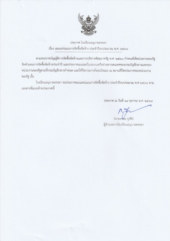 ประกาศโรงเรียนอนุบาลสงขลาเรื่อง เผยแพร่แผนการจัดซื้อจัดจ้าง ประจำปีงบประมาณ พ.ศ. 2569 คลิ๊กเพื่อดูรายละเอียด
