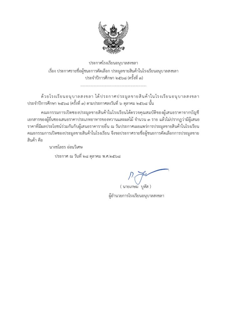 ประกาศโรงเรียนอนุบาลสงขลา เรื่อง ประกาศรายชื่อผู้ชนะการคัดเลือก ประมูลขายสินค้าในโรงเรียนอนุบาลสงขลา ประจำปีการศึกษา 2568 ครั้งที่ 3