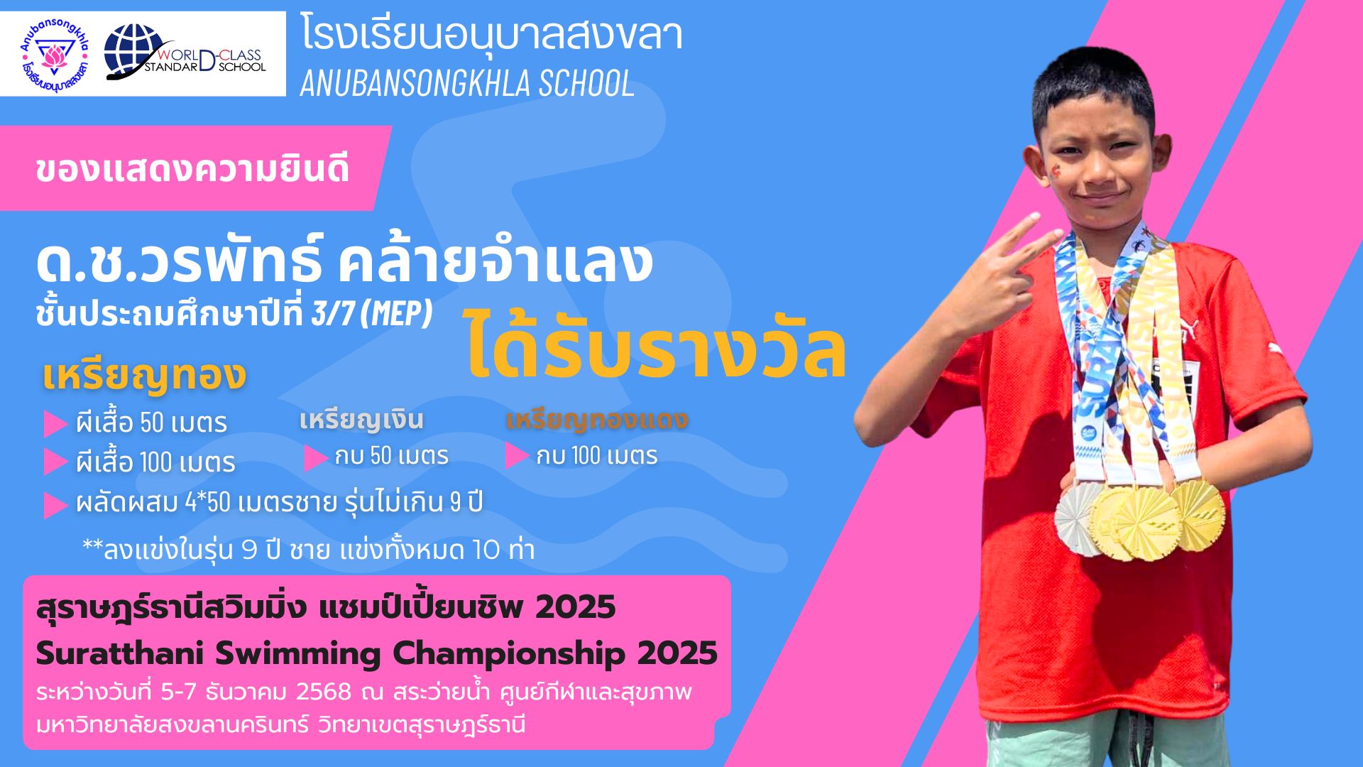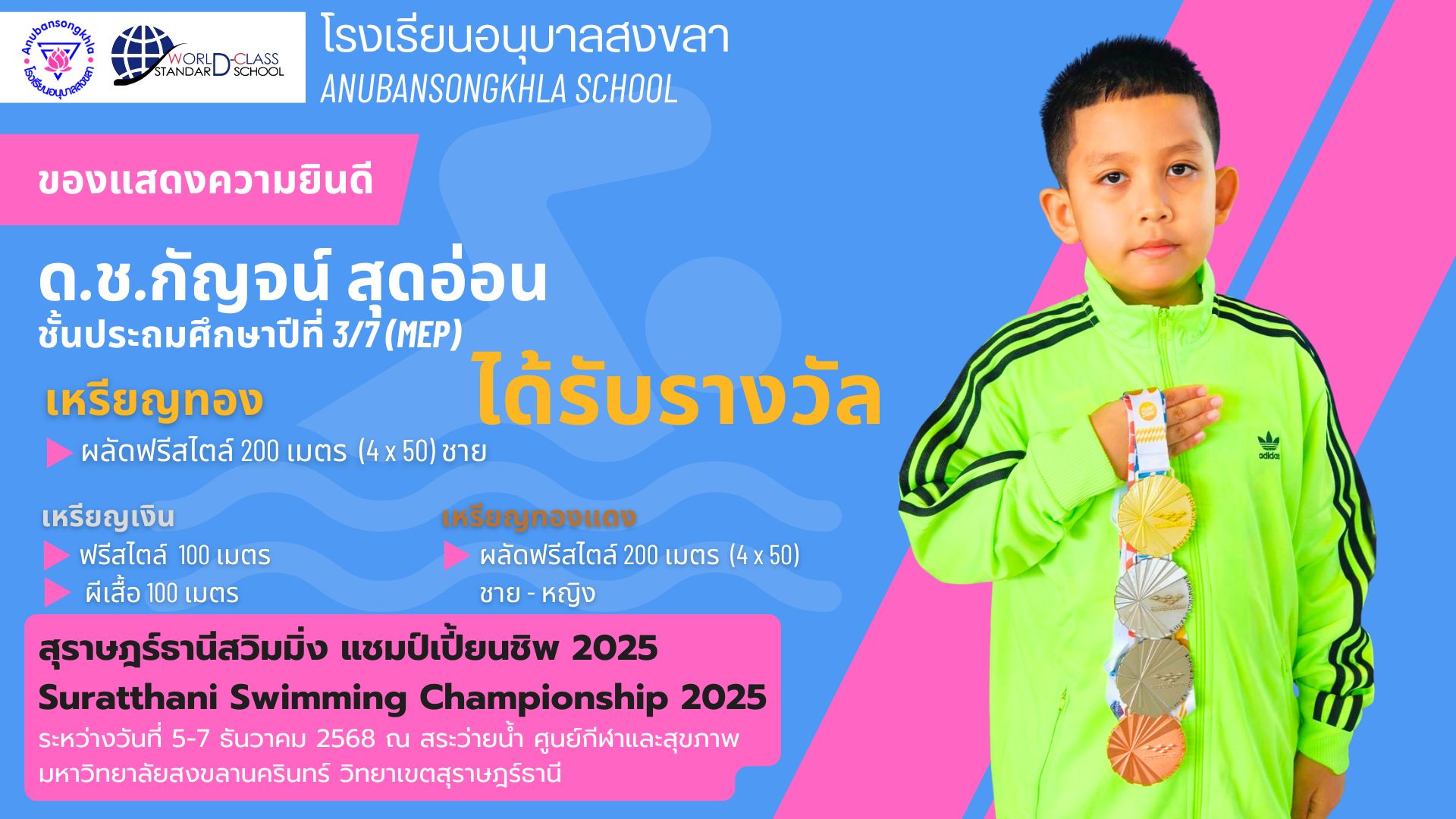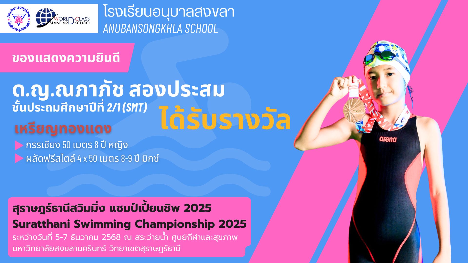 โรงเรียนอนุบาลสงขลา ขอแสดงความยินดีกับนักเรียนที่ได้รับรางวัลจากการแข่งขัน สุราษฎร์ธานีสวิมมิ่ง แชมป์เปี้ยนชิพ 2025 Suratthani Swimming Championship 2025 ระหว่างวันที่ 5-7 ธันวาคม 2568 ณ สระว่ายน้ำ ศูนย์กีฬาและสุขภาพ มหาวิทยาลัยสงขลานครินทร์ วิทยาเขตสุราษฎร์ธานี