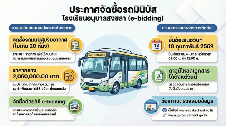 ประกาศโรงเรียนอนุบาลสงขลา เรื่อง ประกาศประกวดราคาซื้อจัดหายานพาหนะสนับสนุนกิจกรรมนักเรียน (รถมินิบัสปรับอากาศไม่เกิน 20 ที่นั่ง) ด้วยวิธีประกวดราคาอิเล็กทรอนิกส์ (e-bidding)