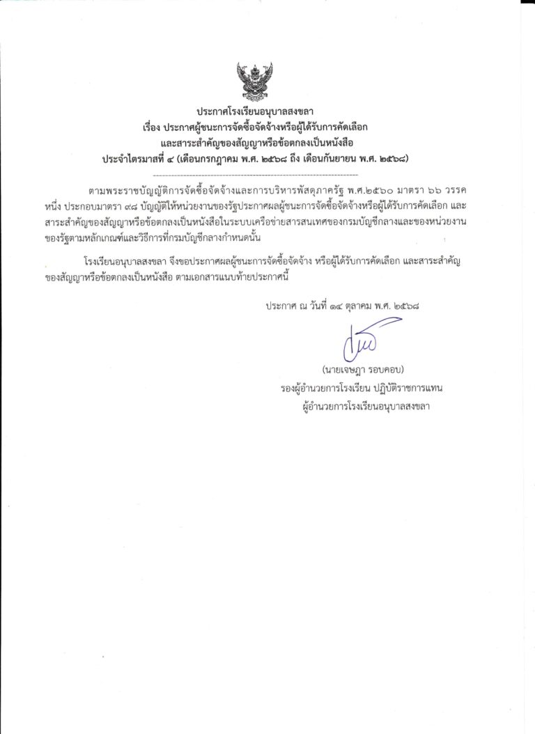 ประกาศโรงเรียนอนุบาลสงขลา เรื่อง ประกาศผู้ชนะการจัดซื้อจัดจ้างหรือผู้ได้รับการคัดเลือก และสาระสำคัญของสัญญาหรือข้อตกลงเป็นหนังสือ ประจำไตรมาสที่ 4 (เดือนกรกฎาคม พ.ศ. 2568 ถึง เดือนกันยายน พ.ศ. 2568)