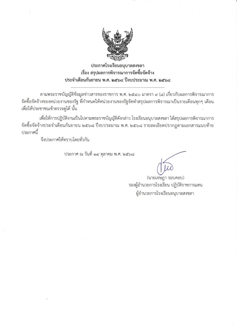 ประกาศโรงเรียนอนุบาลสงขลา เรื่อง ประกาศผู้ชนะการจัดซื้อจัดจ้างหรือผู้ได้รับการคัดเลือก และสาระสำคัญของสัญญาหรือข้อตกลงเป็นหนังสือ ประจำไตรมาสที่ 4 (เดือนกรกฎาคม พ.ศ. 2568 ถึง เดือนกันยายน พ.ศ. 2568)