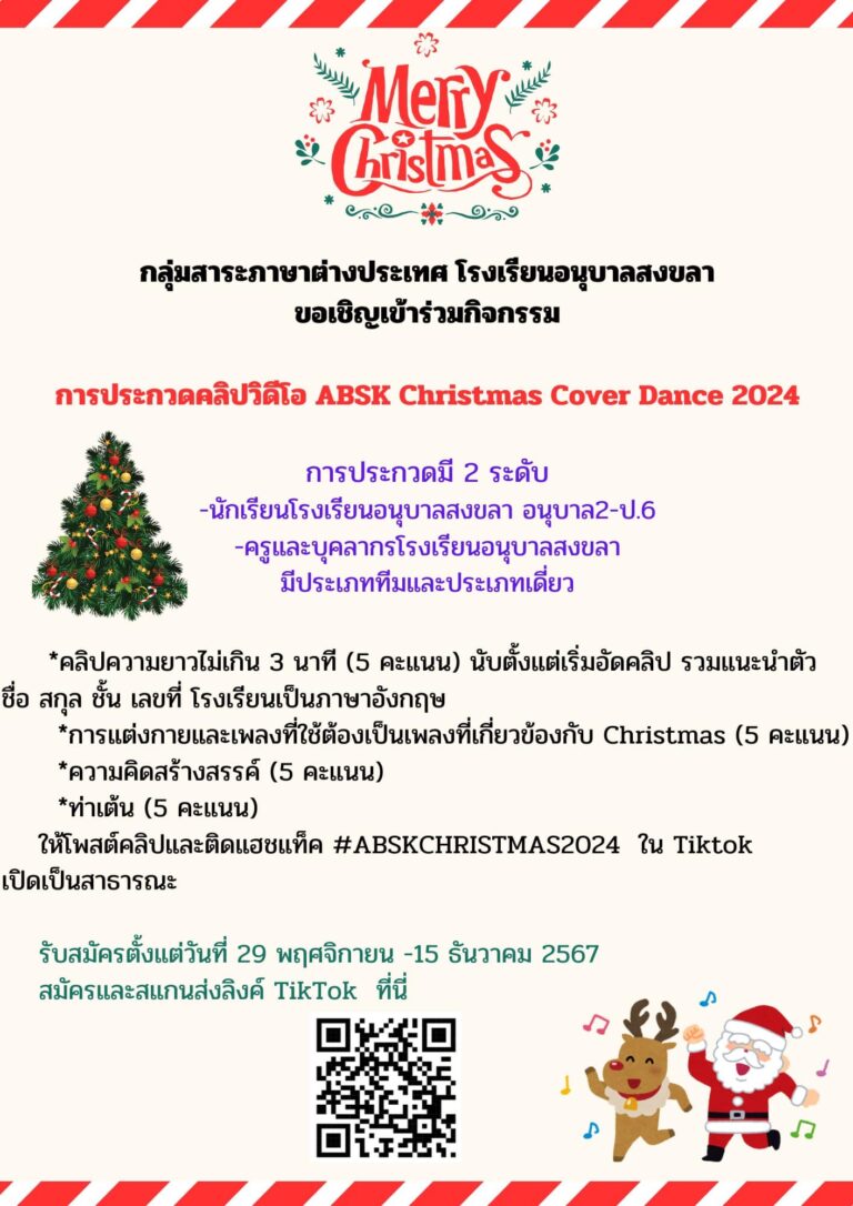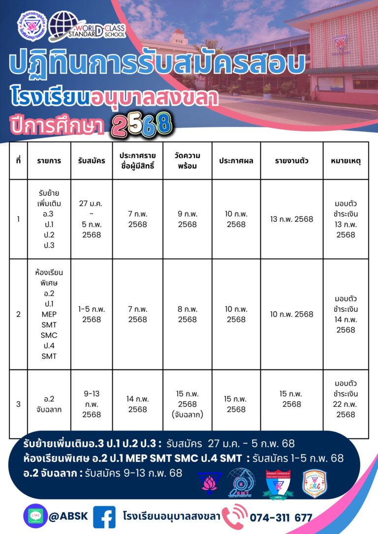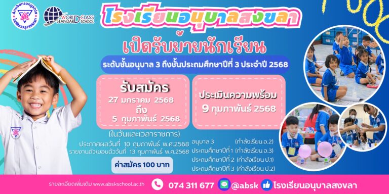 โรงเรียนอนุบาลสงขลาขอเชิญผู้ปกครอง นักเรียน และผู้ที่สนใจเข้าร่วมกิจกรรม ABSK Open House เปิดบ้านวิชาการอนุบาลสงขลา วันอาทิตย์ที่ 19 มกราคม 2568 เวลา 8.00-14.00 น. บริเวณใต้โดมอเนกประสงค์