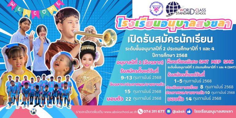โรงเรียนอนุบาลสงขลาขอเชิญผู้ปกครอง นักเรียน และผู้ที่สนใจเข้าร่วมกิจกรรม ABSK Open House เปิดบ้านวิชาการอนุบาลสงขลา วันอาทิตย์ที่ 19 มกราคม 2568 เวลา 8.00-14.00 น. บริเวณใต้โดมอเนกประสงค์ พบกับกิจกรรมมากมาย อาทิเช่น – พิธีมอบเกียรติบัตรวิชาการเพชรยอดบงกช ระดับชั้นประถมศึกษาปีที่ 1-6 กิจกรรมห้องเรียนพิเศษ – ห้องเรียนพิเศษวิทย์-คณิต (SMT) – โครงการจัดการเรียนการสอนตามหลักสูตรกระทรวงศึกษาธิการเป็นภาษาอังกฤษ (MEP) ห้องเรียนพิเศษภาษาจีน (SMC) – ห้องเรียนปัญญาประดิษฐ์…