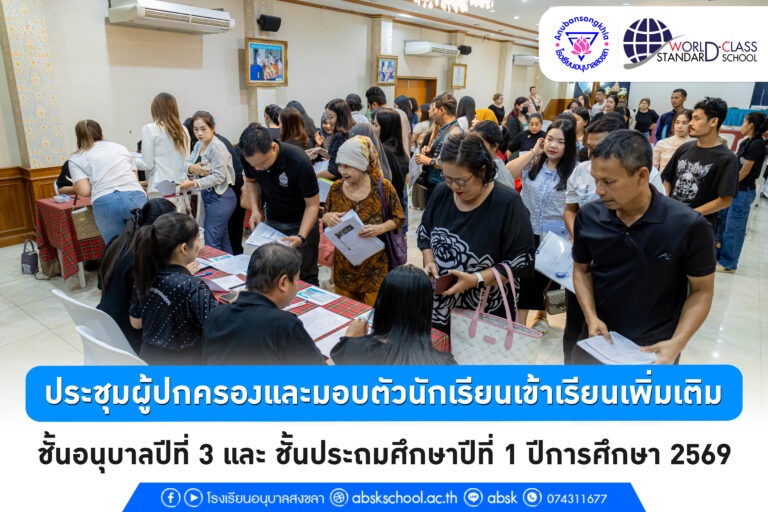 ประชุมผู้ปกครองและมอบตัวนักเรียนเข้าเรียนเพิ่มเติม นางมรกต ฉัตรจินดา รองผู้อำนวยการโรงเรียนอนุบาลสงขลา ได้ดำเนินการประชุมผู้ปกครองและมอบตัวนักเรียนเข้าเรียนเพิ่มเติม ระดับชั้นอนุบาลปีที่ 3 และชั้นประถมศึกษาปีที่ 1 ประจำปีการศึกษา 2569 เพื่อชี้แจงแนวทางการจัดการเรียนการสอน นโยบายของโรงเรียน ตลอดจนสร้างความเข้าใจอันดีระหว่างโรงเรียนและผู้ปกครอง การประชุมในครั้งนี้ได้รับความร่วมมือจากผู้ปกครองเป็นอย่างดี ซึ่งถือเป็นส่วนสำคัญในการร่วมกันพัฒนาผู้เรียนให้มีคุณภาพ มีความรู้ ความสามารถ และมีคุณลักษณะอันพึงประสงค์ต่อไป โรงเรียนอนุบาลสงขลา ขอขอบพระคุณผู้ปกครองทุกท่านที่ให้ความไว้วางใจและให้ความร่วมมือด้วยดีเสมอมา