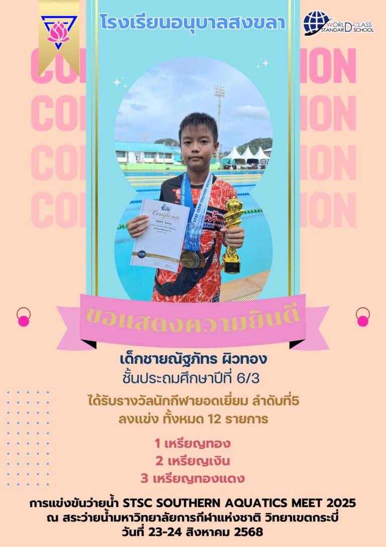 ขอแสดงความยินดีกับความสามารถและความภาคภูมิใจของลูกๆ โรงเรียนอนุบาลสงขลา ด.ญ.นิษฐา โดดโดย (น้องทับทิม) ป.6/1 SMT ได้รับรางวัล รองชนะเลิศอันดับ 3 หนูน้อยสมิหลา ในงานเทศกาลอาหารสองทะเล ครั้งที่ 24 ประจำปี 2568 ด.ญ.กัญญพัชร รัตนบัวชุม (น้องมิวสิค) ป.4/7 MEP ได้รับรางวัล หนูน้อย First Stage การประกวดหนูน้อยสมิหลา 2568 ด.ญ.ชมพูนุท อยู่คง (น้องน้ำเพชร) ป.6/2…