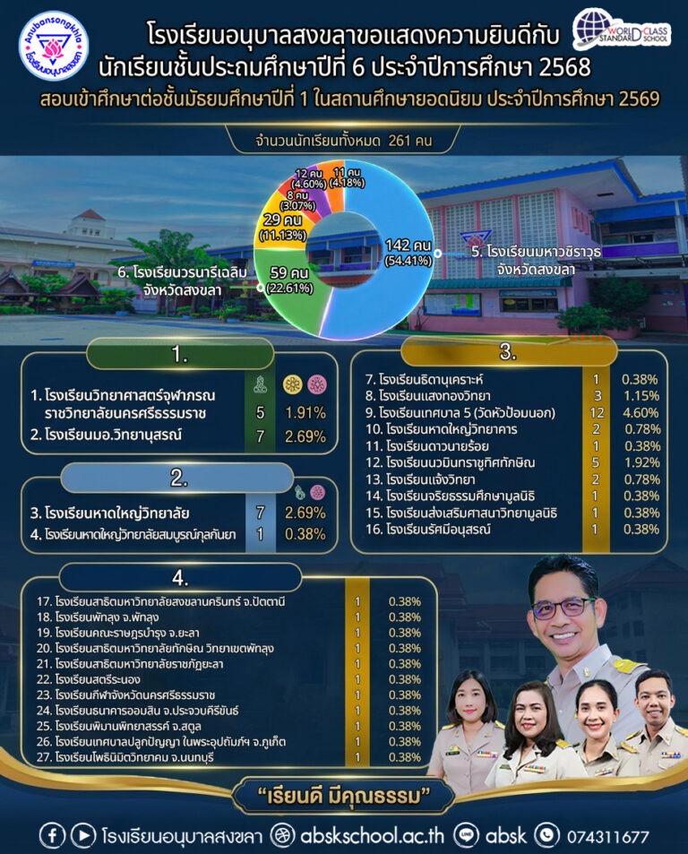 โรงเรียนอนุบาลสงขลา ขอแสดงความยินดีกับนักเรียนชั้นประถมศึกษาปีที่ 6 ประจำปีการศึกษา 2568 🎓 ที่สามารถสอบเข้าศึกษาต่อในระดับชั้นมัธยมศึกษาปีที่ 1 ในสถานศึกษาชั้นนำ ประจำปีการศึกษา 2569 ได้อย่างยอดเยี่ยม